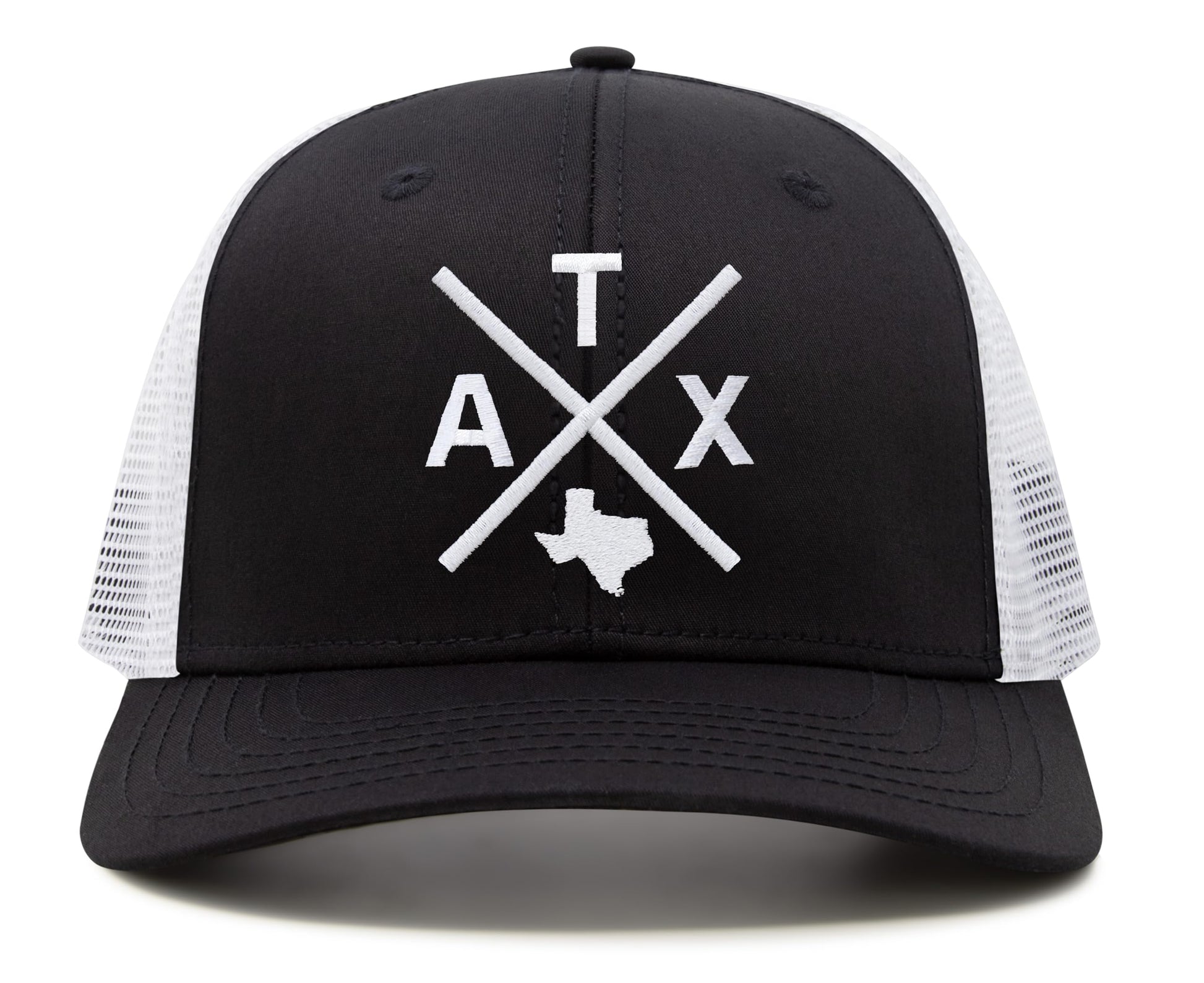 International Tie Austin ATX Trucker Hat for Men and Women – Snapback Baseball Cap (Black/White)