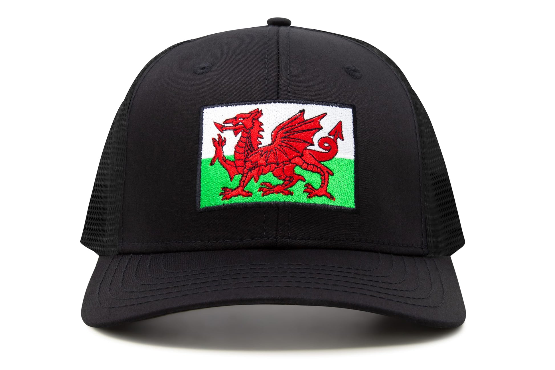 International Tie Country Hat for Men and Women, Adjustable Snapback Trucker Baseball Cap with Embroidered Patch (Wales, All Black)