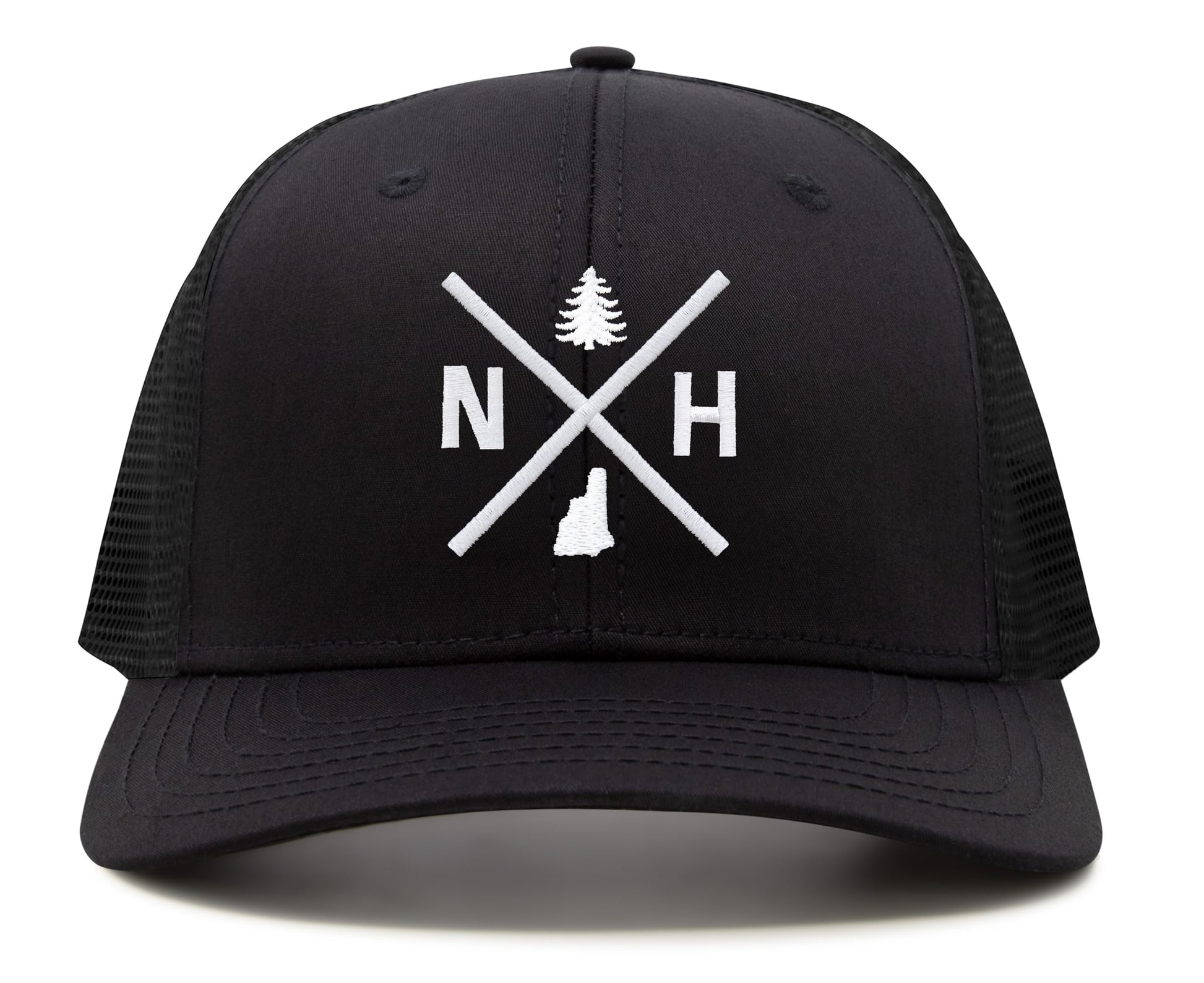 International Tie Hat for Men and Women, Adjustable Snapback Trucker Baseball Cap, Embroidered Cross Logo (NH- New Hampshire, All Black)