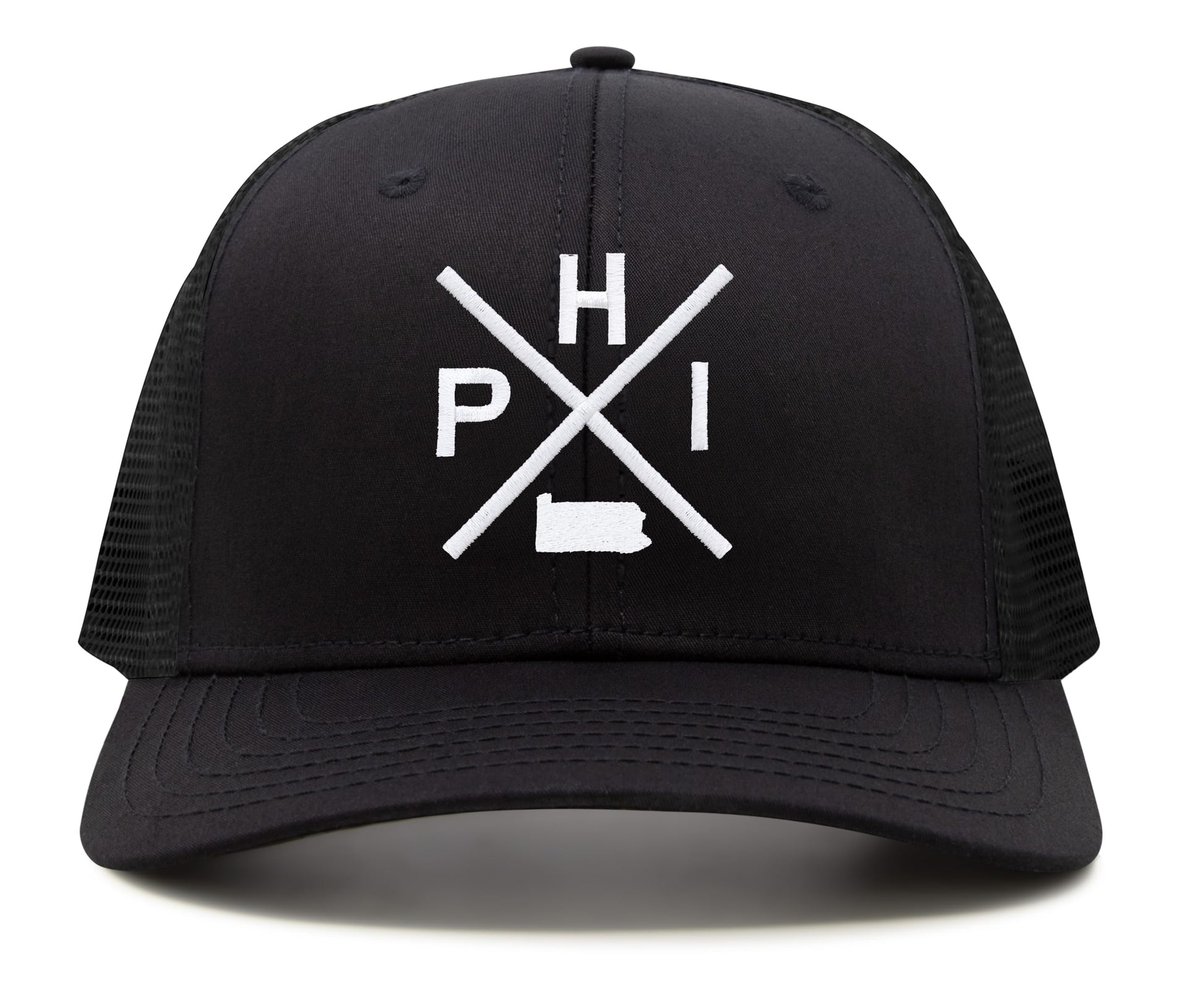 International Tie Hat for Men and Women, Adjustable Snapback Trucker Baseball Cap, Embroidered Cross Logo (PHI - Philadelphia, All Black)