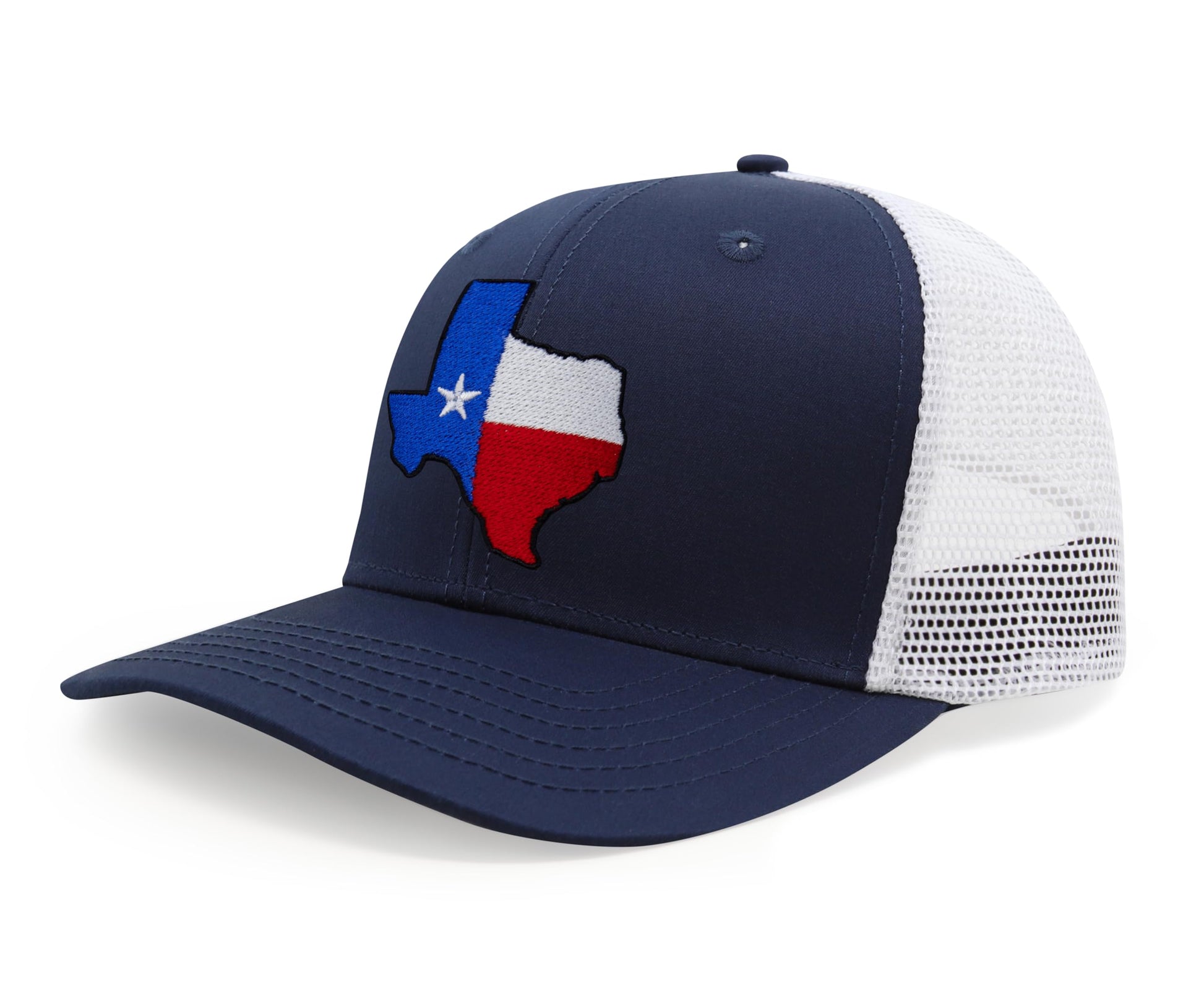 International Tie Hat for Men and Women, Adjustable Snapback Trucker Baseball Cap with Embroidered Patch (Texas, Navy White)